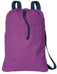 Available in several vibrant colors this soft cotton cinch pack has contrast webbing straps and a zippered pocket for additional storage.