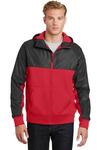 This jacket combines moisture-wicking fleece with an embossed patterned woven overlay that resists wind and water.